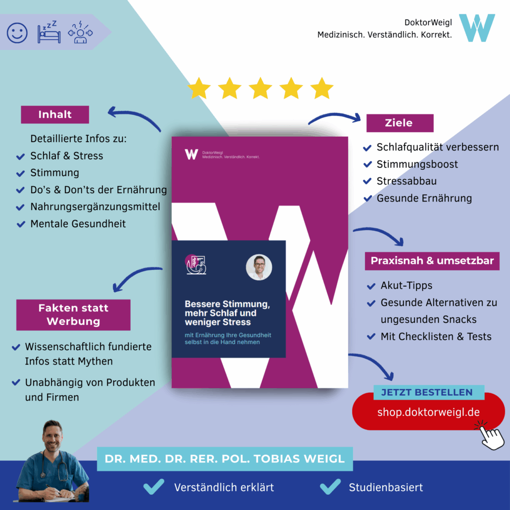 Dieser Ratgeber bietet wissenschaftlich fundierte Informationen, wie Ernährung und Nahrungsergänzungsmittel Ihnen helfen können, Stress abzubauen, besser zu schlafen und Ihre Stimmung zu verbessern. Sie erfahren, welche Nahrungsergänzungsmittel wirklich nützlich sein können – und welche nur leere und teure Werbeversprechen sind, die schlimmstenfalls sogar Ihrer Gesundheit schaden.